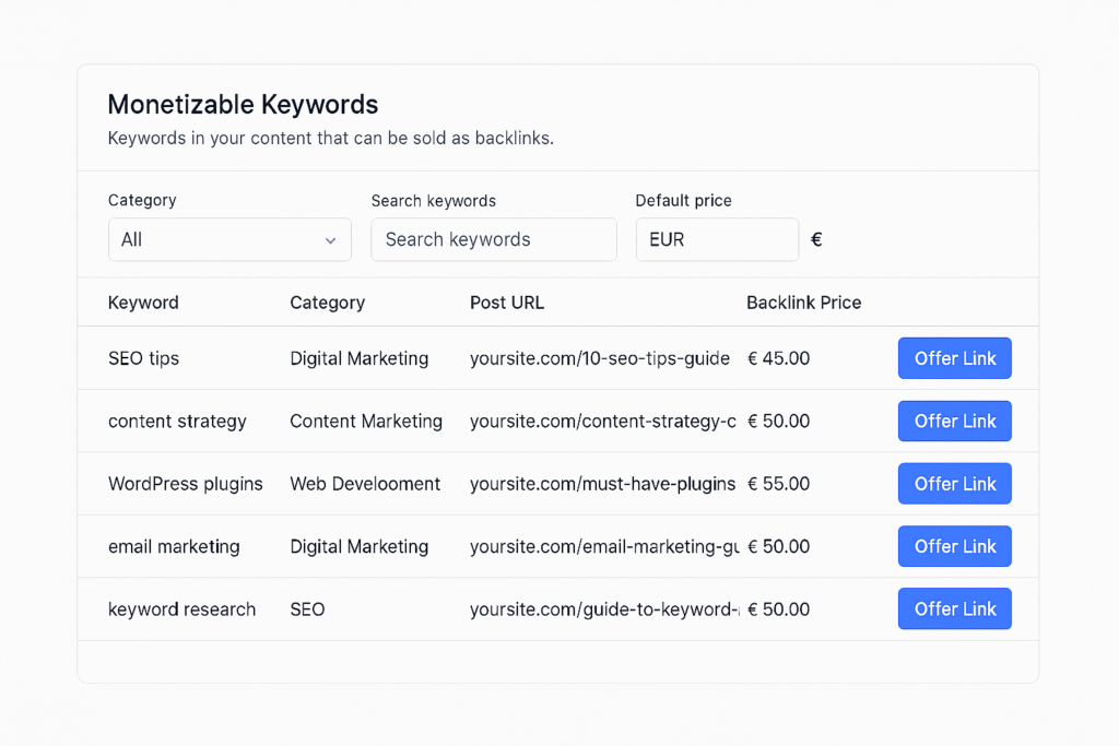 Our plugin scans your content and identifies keywords that are on demand as link anchors